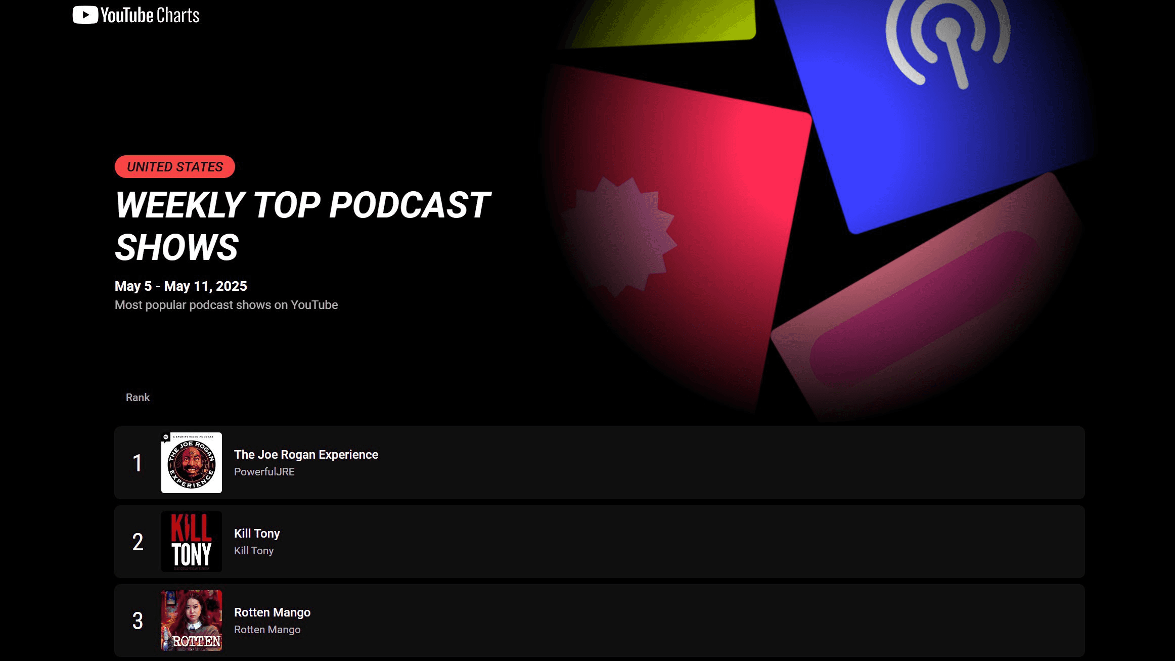 YouTube has rolled out a new weekly chart of most‐watched podcasts in the U.S., with The Joe Rogan Experience topping the list.