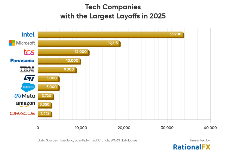 Major firms including Intel, Amazon, Microsoft, and other Silicon Valley giants are leading the layoffs.
